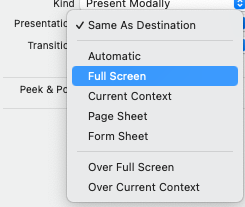 이 때 전환 효과는 Modal의 Over Full Screen 혹은 Over Current Context 를 사용하면 된다.