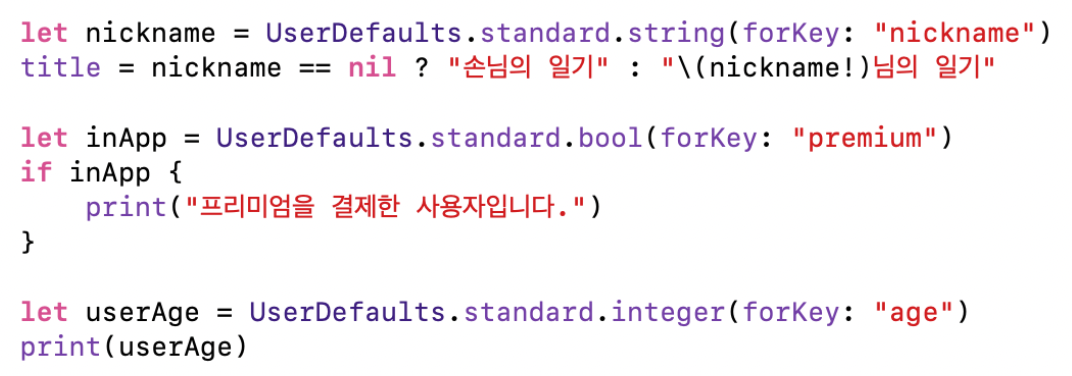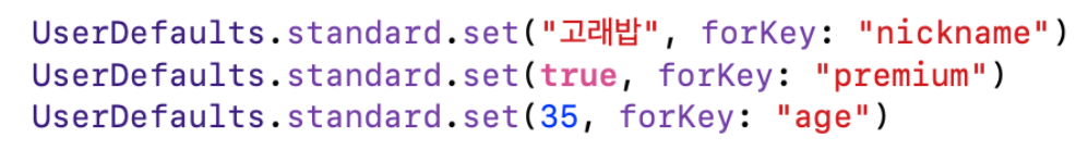 실제로 UserDefaults를 사용하려면 아래와 같은 형식으로 코드를 장성한다.