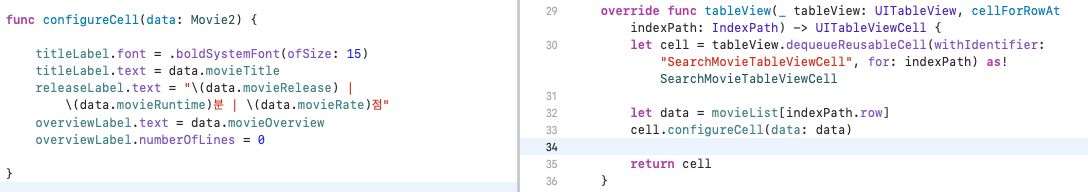 원래라면 cellForRowAt 내부에 작성할 예정이었던 코드를, cell 파일에서 함수로 묶어놓은 것이다.