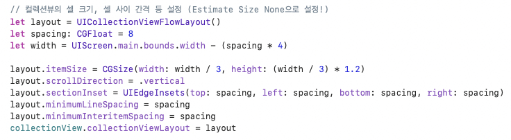 셀의 데이터와 설정을 담당할 configureCell 함수와, 레이아웃을 담당할 layoutCell 함수는 CollectionViewCell 파일 안에 작성했다.