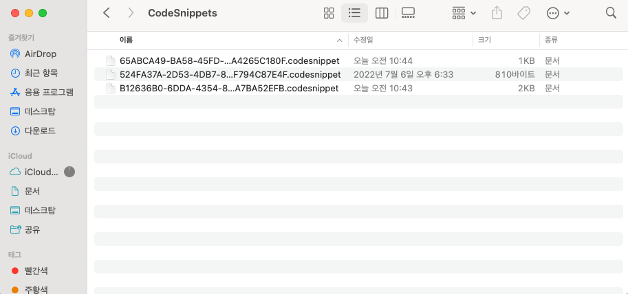 Xcode 폴더의 UserData 로 들어가면 CodeSnippets 폴더가 나오는데, 여기에 다 저장이 되어 있다!