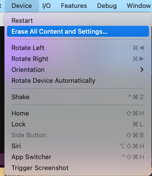 - Erase All Content and Settings... : 시뮬레이터 리셋