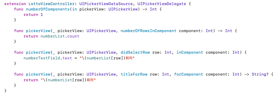 그리고 var lottoPickerView = UIPickerView() 와 같이 아웃렛 변수가 아닌 일반적인 인스턴스 변수처럼 선언하면, View 위에 항상 띄워놓는게 아닌 필요에 의해 호출(Button을 눌렀을 때, TextField를 눌렀을 때 등)할 수 있다.