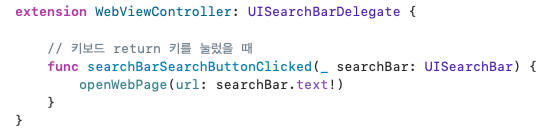 searchBarSearchButtonClicked 라는 이름의 메서드를 꺼내서, return 키를 눌렀을 때 실제로 검색이 되는 코드를 작성했다.