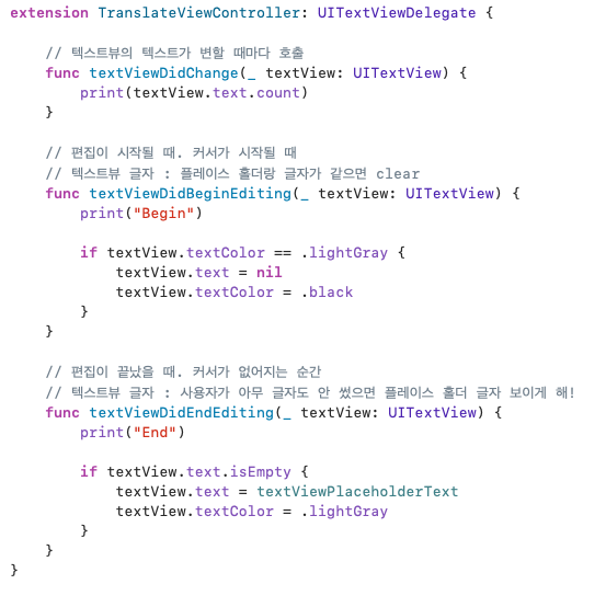 UITextViewDelegate : UITextViewDelegate를 채택하여 아래와 같이 활용할 수 있다.