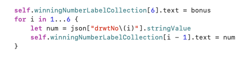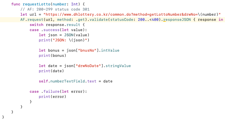 SwiftyJSON와 Alamofire를 활용해 복권 당첨 번호를 가져오는 코드이다.