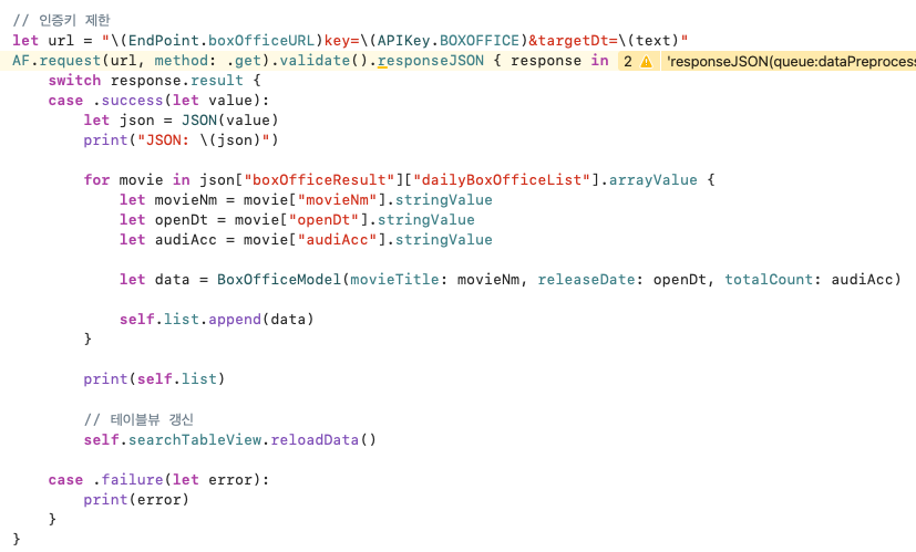 어제 날짜를 문자열로 반환하는 yesterday 메서드를 작성하고, viewDidLoad의 requestBoxOffice 파라미터로 전달했다.