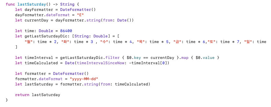 처음에는 과제의 '매주 토요일'에 집착한 결과, 저번주 토요일 날짜를 반환하는 함수를 만들었다.