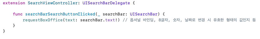 extension을 활용해 프로토콜을 채택 후 서치바 버튼 클릭 함수를 작성하고, 그 안에서 정보를 받아오는 메서드를 호출했다.