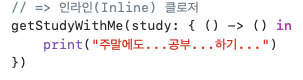 Inline Closure : 함수의 매개변수 내에 클로저가 그대로 들어간 형태로, 코드를 생략하지 않고 클로저 구문을 작성한다.