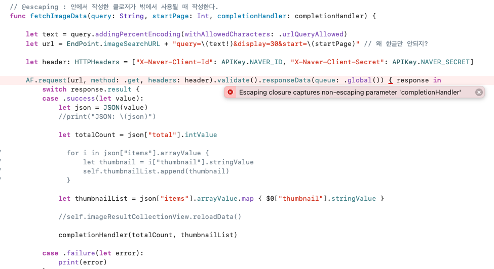 그래서 전달받을 인자 (query, startPage) 와 전달할 인자 (completionHandler) 를 추가했더니 위와 같은 에러가 발생했다.