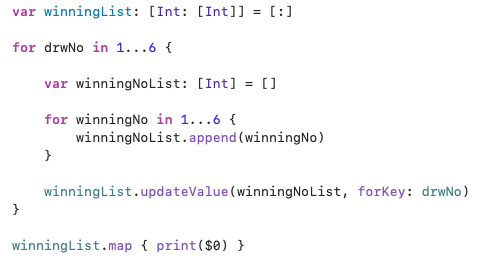 우선 UserDefaults에 값을 저장하기 위해, 회차를 Key로 가지고, 당첨번호 리스트를 Value로 가지는 변수를 만들려고 한다.