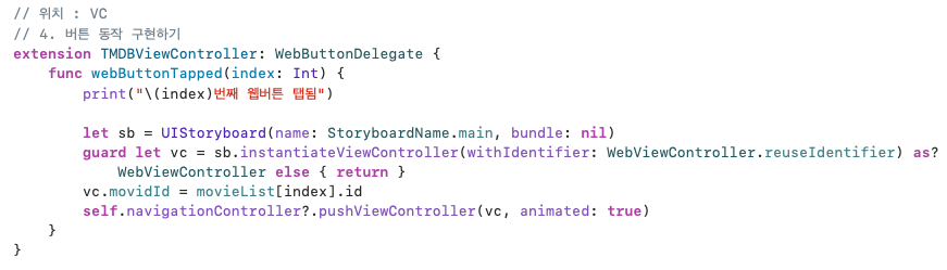 버튼을 인식하는 것까지는 성공적으로 구현했으니, 웹뷰컨트롤러로 영화의 Id를 전달하고, push하는 코드를 작성했다.