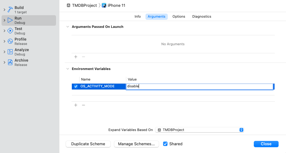 Environment Variables에서 + 버튼을 누르고, Name에 OS_ACTIVITY_MODE, Value에 disable를 입력하면 된다!