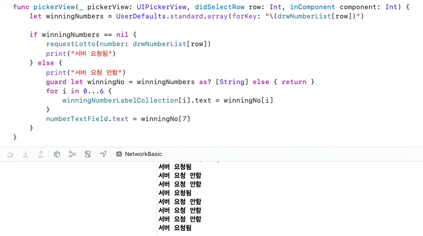 서버 통신을 하되, 기존에 검색했던 회차에 대해서는 UserDefaults에 해당 회차에 대한 내용을 저장하고, 기존에 검색했던 회차를 다시 검색한 경우에는 서버 통신을 진행하지 않고 UserDefaults에서 값을 가져올 수 있도록 구현하기