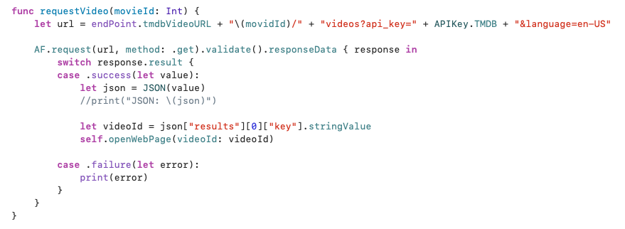 전달받은 영화 아이디를 통해 예고편을 서버통신으로 받아오고, 가장 첫 번째 예고편의 비디오 아이디를 받아온다.