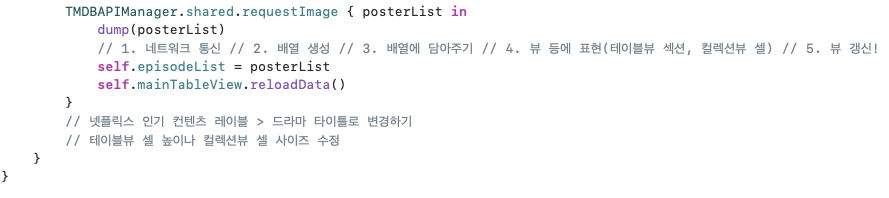 27회차 과제로 구현한 레이아웃에서 TMDB로 가져온 데이터를 통해 테이블뷰/컬렉션뷰 구성