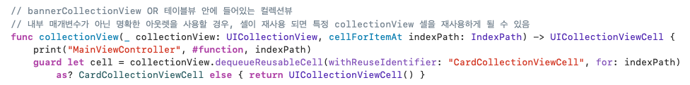 dequeueReusableCell을 설정할 때 주의해야 하는 것이, let cell 을 초기화할 때 사용하는 테이블뷰/컬렉션뷰의 명칭이다.