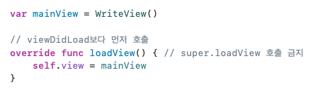 loadView를 호출하여 직접 초기화를 하면 되는데, 이 때 코드로 구현한 경우에는 super 메서드를 직접 호출하지 말아야 한다.