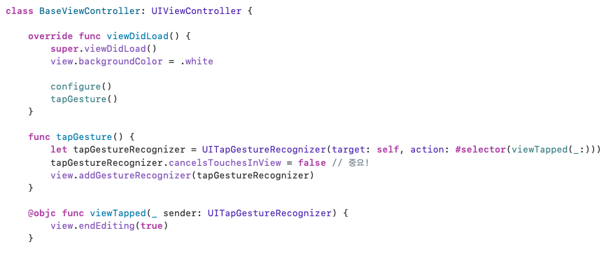 BaseViewController에서 구현하고 호출하면 상속받은 클래스들은 별도의 작업 없이 제스쳐를 사용할 수 있다.