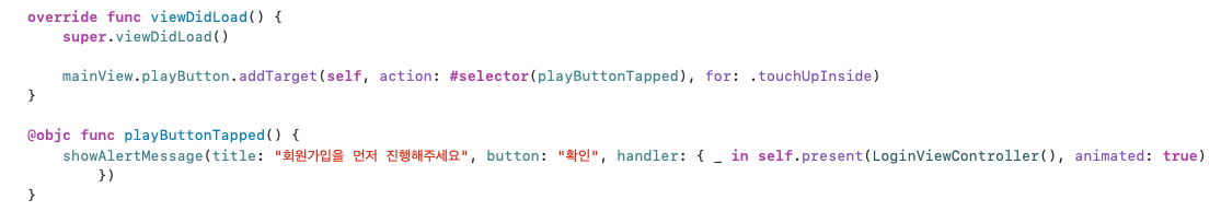 - 재생버튼을 누를 경우, 얼럿을 통해 LoginViewController로 화면 전환