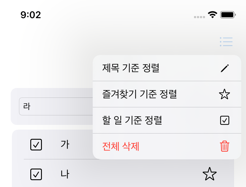- UIMenu를 사용해 할일 기준 정렬, 즐겨찾기순 정렬, 제목순 정렬 구현