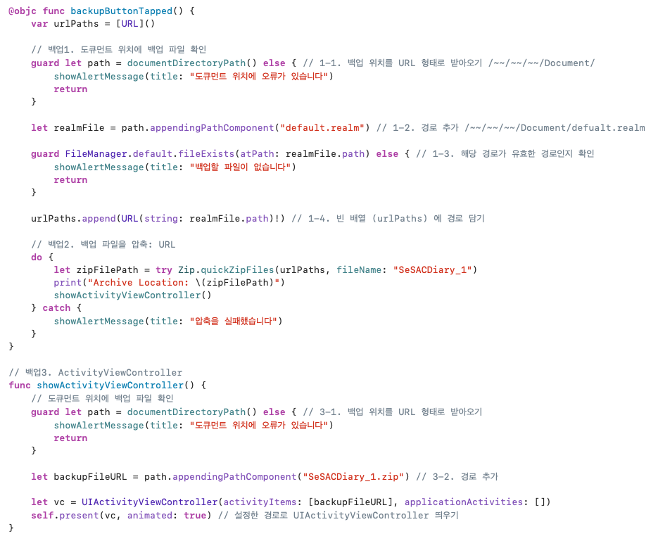 백업의 순서는 크게 백업할 파일의 위치 확인 ➡️ 파일 압축 ➡️ 압축한 파일을 저장/UIActivityView 띄우기 의 3단계로 볼 수 있다.