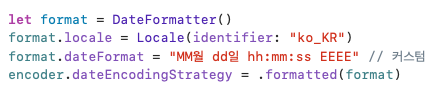 dateEncodingStrategy는 iso8601이 가장 기본적인 형태이며, 오른쪽처럼 formatter를 설정해서 사용할 수도 있다.