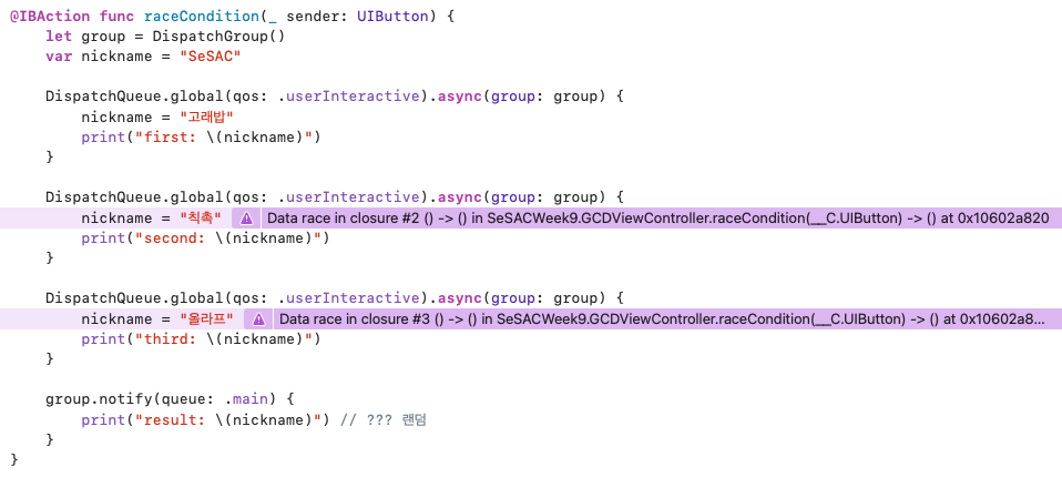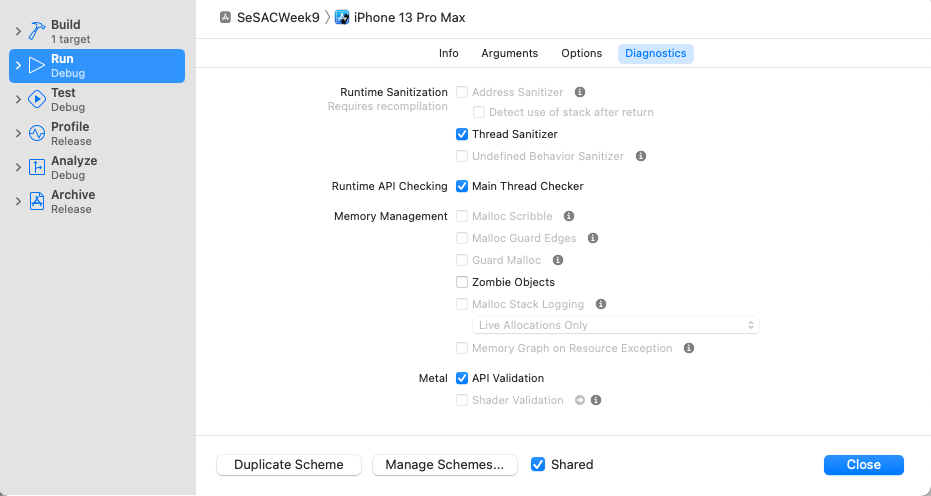 이렇게 스레드의 순서에 문제가 있는지 확인하고 싶을 때는 설정에서 Thread Sanitizer를 체크하면 컴파일에서 확인 가능하다.