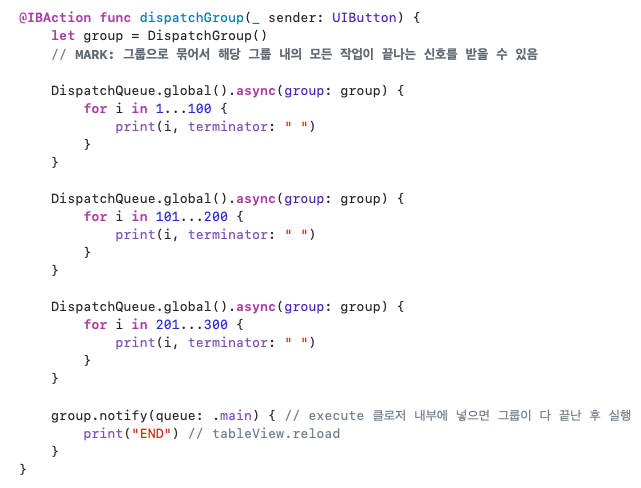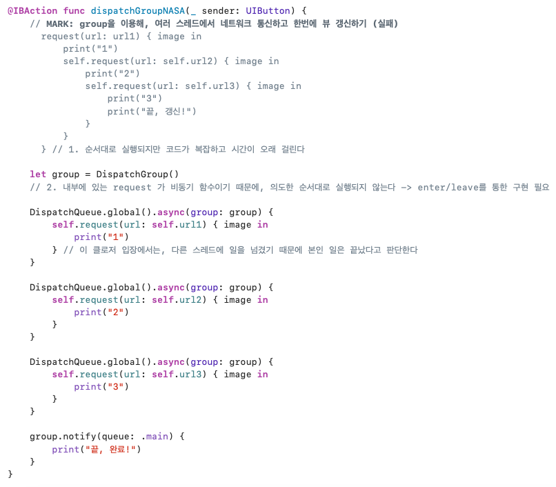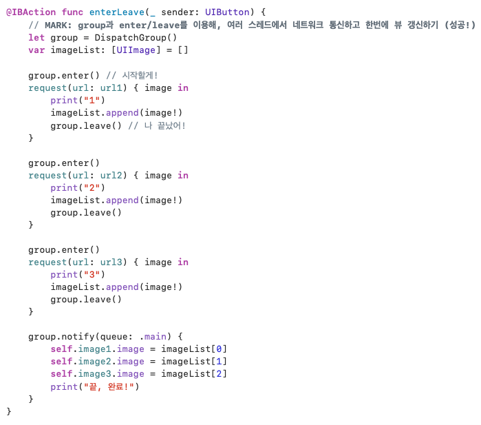 group 안에서 비동기 코드를 실행하고 싶을 때에는, enter-leave 를 사용해 시작과 끝을 명시적으로 알려줄 수 있다.