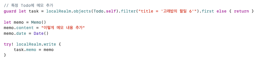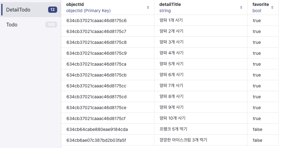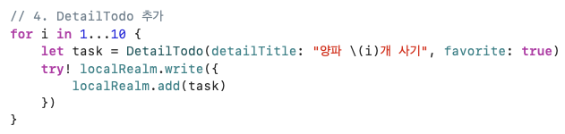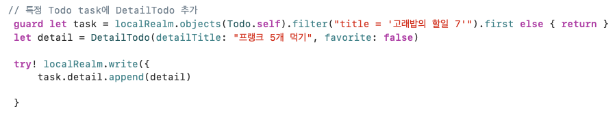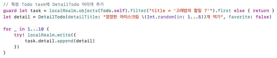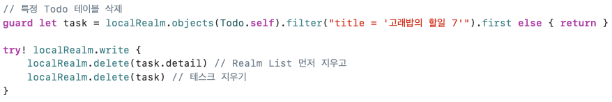 이렇게 생성한 realm 데이터를 삭제할 때에는 Todo를 먼저 삭제할 경우 해당 Todo의 detail 데이터가 제대로 삭제되지 않고 메모리에 남아있을 수 있으므로, 순서를 유의하여 둘 다 삭제해야 한다.
