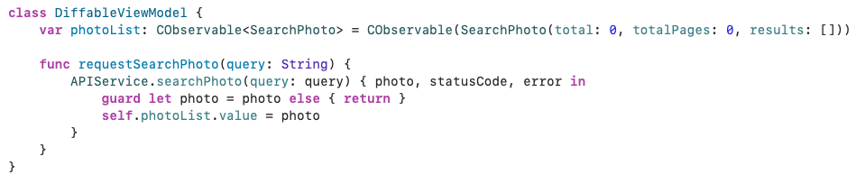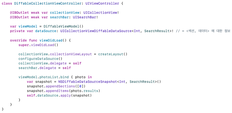 이번에는 73회차에서 구현했던 DiffableViewController를 조금 수정해서, MVVM 형식으로 API 통신을 했다.