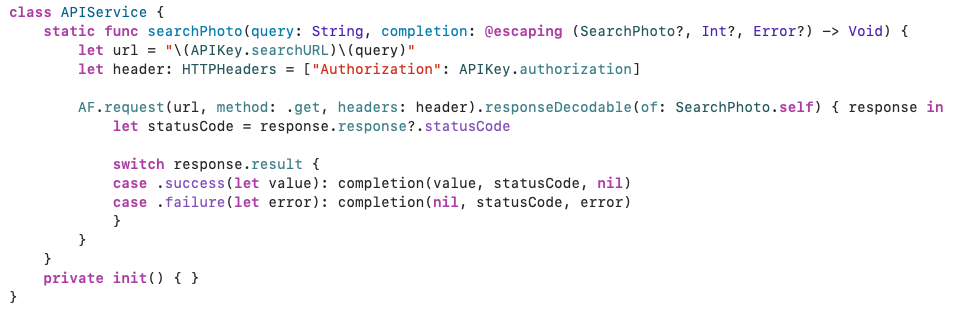 그리고 viewModel도 APIService에게 또 넘기고, 최종적으로는 APIService가 통신을 진행하게 된다.