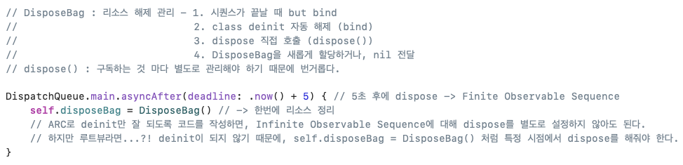 하지만 여러 개를 구독하고 있다면, 일일이 모든 구독을 종료하는 것은 힘들기 때문에 DisposeBag의 인스턴스를 초기화하는 과정을 통해 한번에 리소스를 정리할 수 있다.