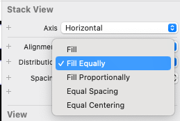 Stack View의 Inspector 창에는 Distribution 이라는 항목이 있는데, 여기서 View들을 어떤식으로 배치할지 설정할 수 있다.