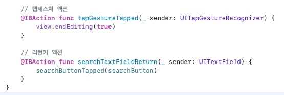 그리고 키보드의 ReturnKey를 눌렀을때도 키보드가 내려가도록 TextField의 Action을 Did End On Exit으로 연결했으며, ReturnKey를 눌렀을 경우 한번 더 검색 버튼을 누르지 않아도 바로 resultLabel에 검색결과가 반영되도록 구현했다.