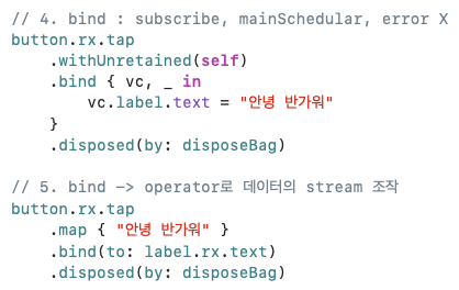 bind는 subscribe와 유사하지만, Main Schedular에서 동작하며 error 이벤트를 방출하지 않는 특성을 지녔다.