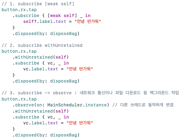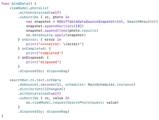 Background Schedular 에서 동작할 수 있는 가능성 (네트워크 통신, 파일 다운로드 등) 이 있기 때문에 Observable의 데이터 흐름을 MainSchedular (메인 쓰레드) 에서 동작할 수 있도록 한 것이 3번의 코드이다.
