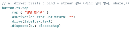 5번의 코드에서는 tap의 ControlEvent<Void> 에 map Operator를 적용해, 데이터의 흐름을 조작했다.