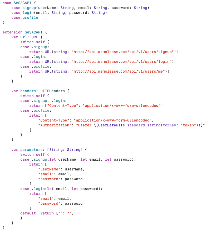 열거형의 연관값을 활용해 url, headers, parameters 등을 관리할 수 있다.