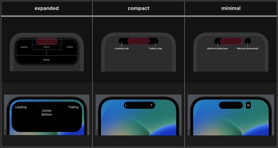 다이나믹 아일랜드는 크게 expanded, compact, minimal 세 가지 형태가 있습니다.