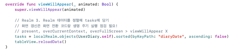 일기를 등록하고 다시 돌아왔을 때 재정렬/리로드를 위해 viewWillAppear에 작성한다.